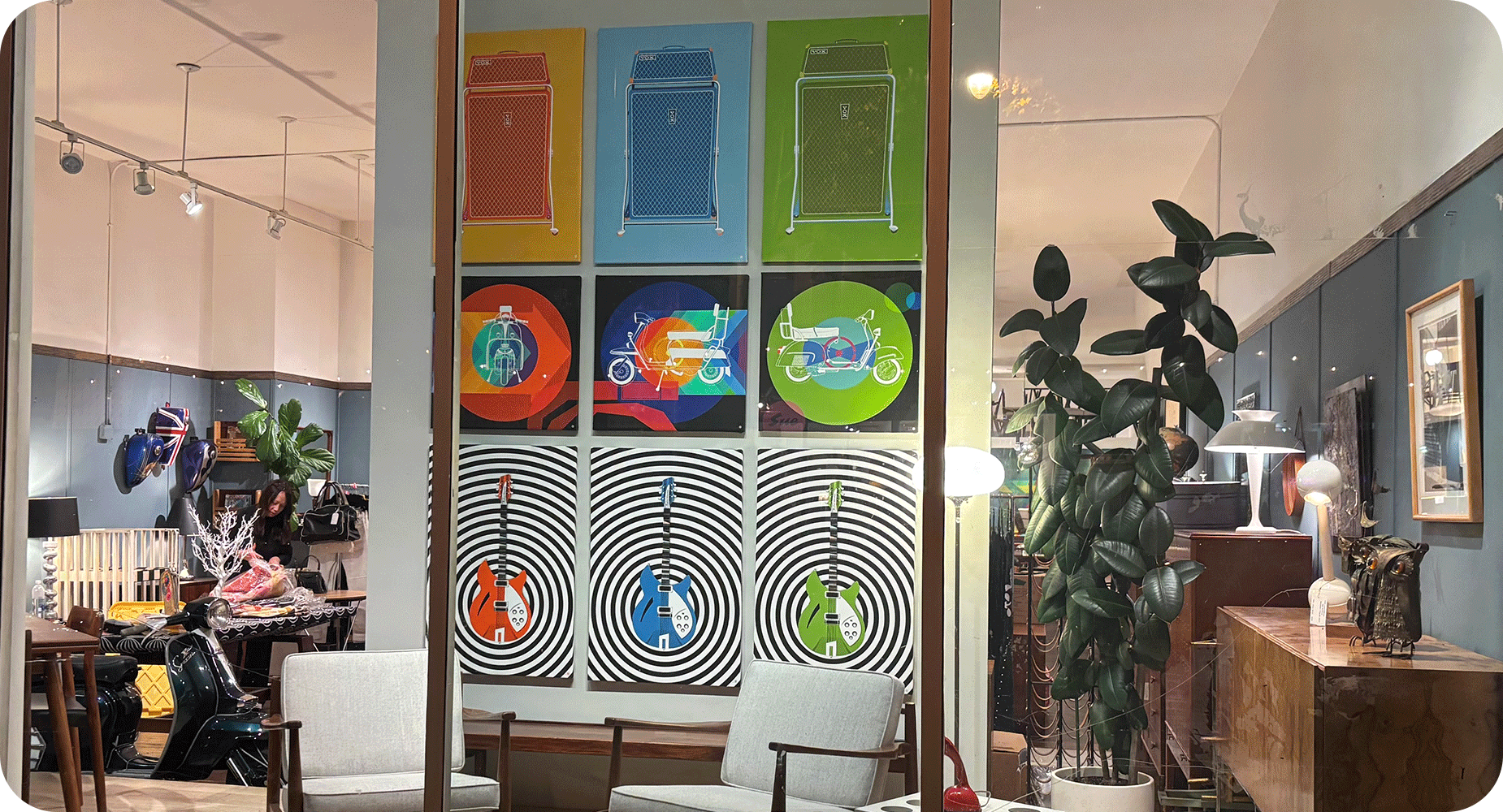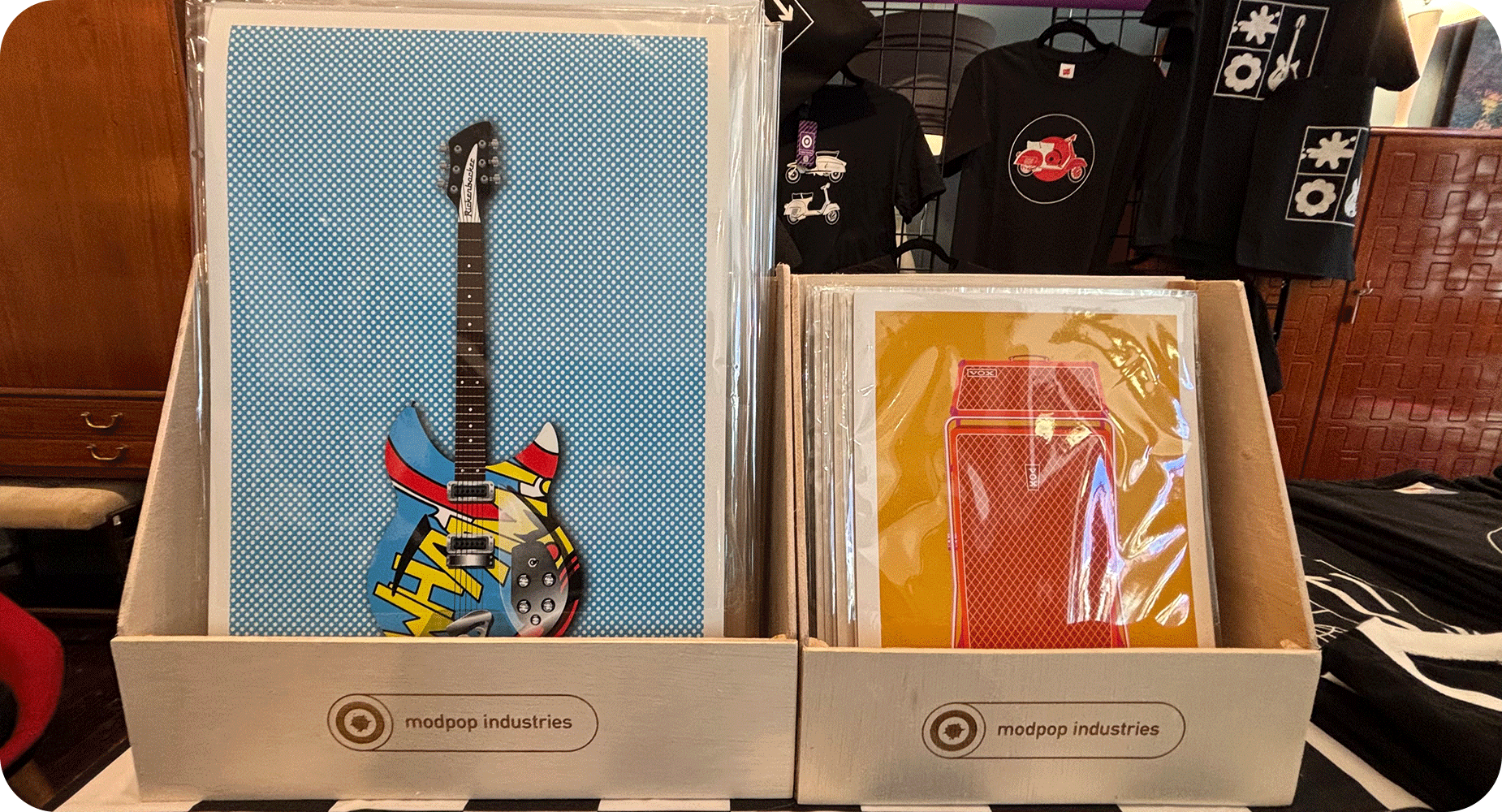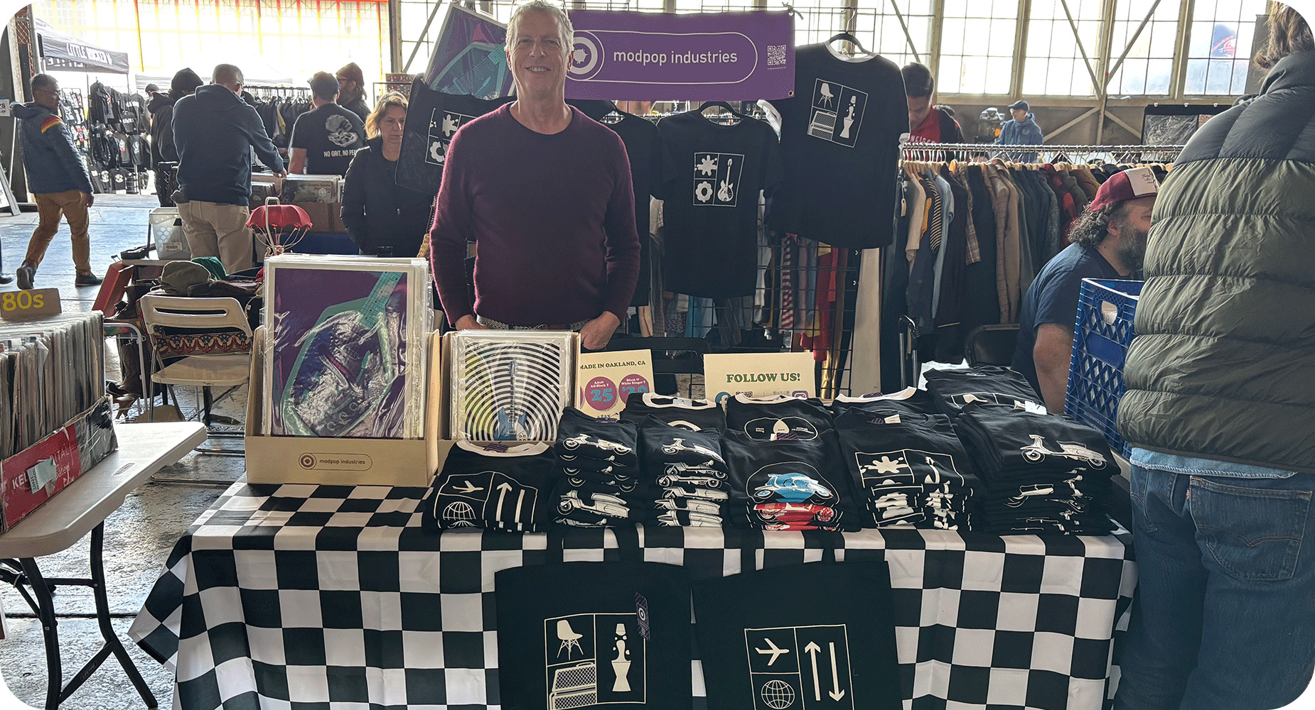 I created the brand Modpop Industries as an outlet for my interest in translating mid-century design sensibilities into the post-modern era products. I screen print (garage-made) my designs onto T-shirts and totes and have high-quality Giclee prints on paper and large canvases for purchase on my site and in select retail establishments. A new digital offfering is in development.
