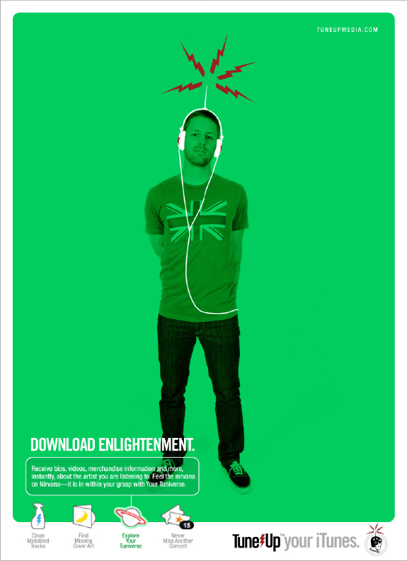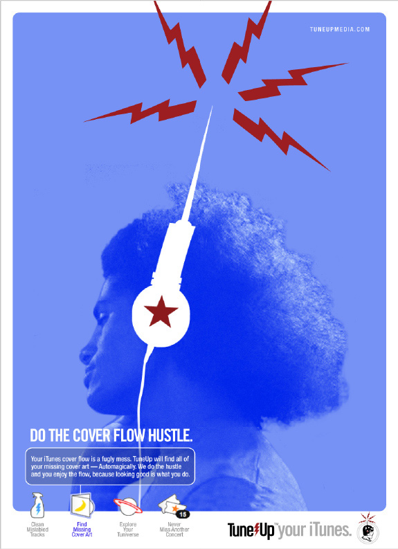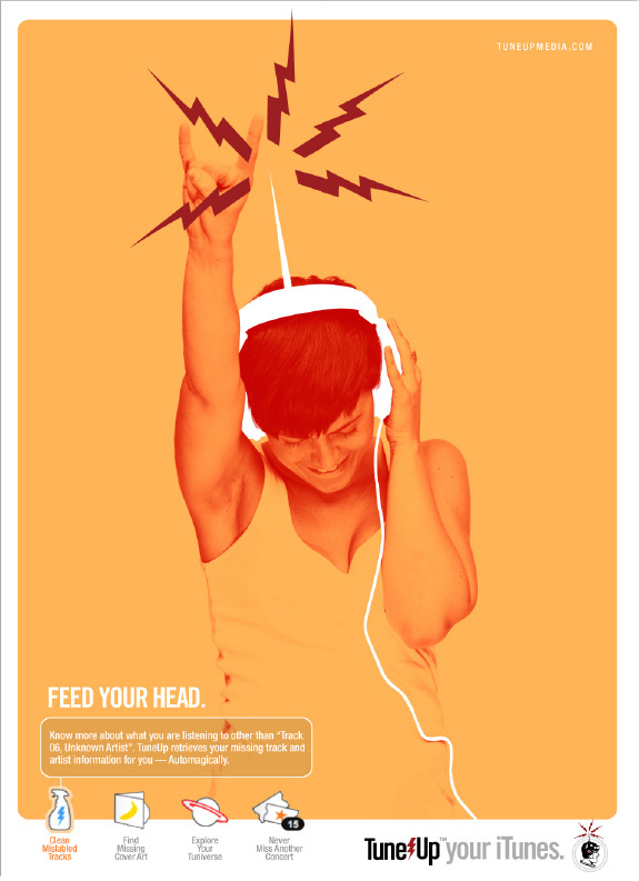 TuneUp Media makes a an awesome iTunes companion app that cleans and adds meta data and album art to all of the unnamed files ('Track 1, 2'...) in your music library—an incredibly useful and time-saving service. We developed posters and animated banners that touted the cool information-adding features as agents of enlightenment and a no-brainer download for smart music enthusiasts. A viral web-cam enabled microsite was planned but not produced.